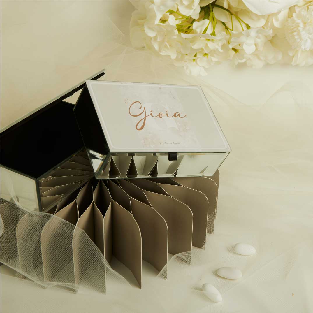 L’articolo si intende compreso di confetti, legatura personalizzata e bigliettino bomboniera color avorio stampato coi nomi degli sposi e la data.